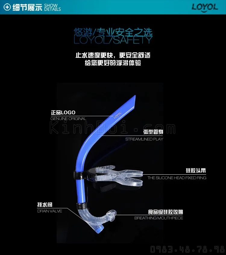 Ống thở giữa có cấu tạo gồm ống uốn cong kết hợp van xả một chiều, cho phép thở tự nhiên và thoát nước thừa ngay lập tức. Dây đai chỉnh được thiết kế vừa với mọi khuôn mặt, giữ ống cố định ở vị trí trung tâm trán.