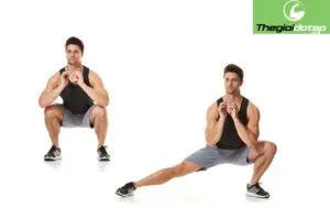 Tập trung vào cơ đùi trong và ngoài. Đứng thẳng, bước rộng sang một bên, gập gối bên đó trong khi giữ chân kia duỗi thẳng. Đẩy trở lại tư thế ban đầu. Thực hiện 3 hiệp, mỗi bên 10-12 lần.